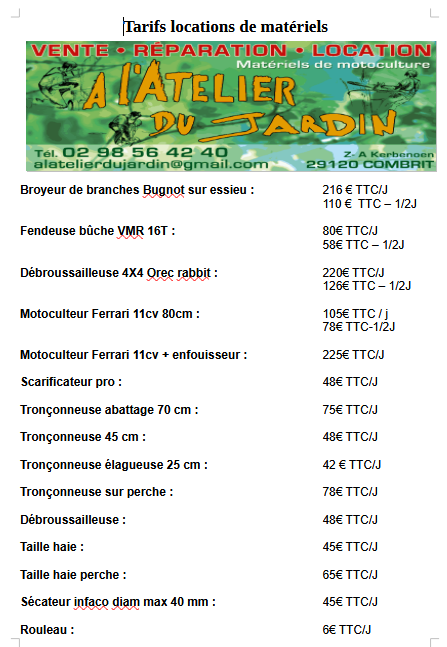 Implantée à Combrit depuis 2011 , la société A l ‘atelier du jardin est spécialisée dans la vente , la réparation et la location de matériels de motoculture auprès des particuliers et des professionnels.